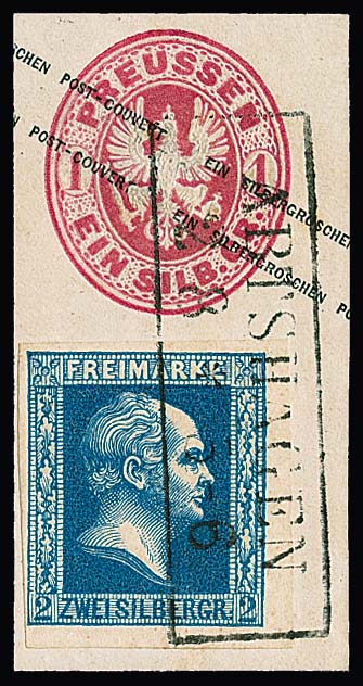 2 Sgr. dunkelblau, Kabinettstück vom rechten Bogenrand auf Wappen-Ganzsachen-Abschnitt 1 Sgr. rosa mit seltenem Ra2 "Abtshagen", sign. Pfenninger, Kruschel, Krause, ex Metzer, ex Slg. Erivan Haub