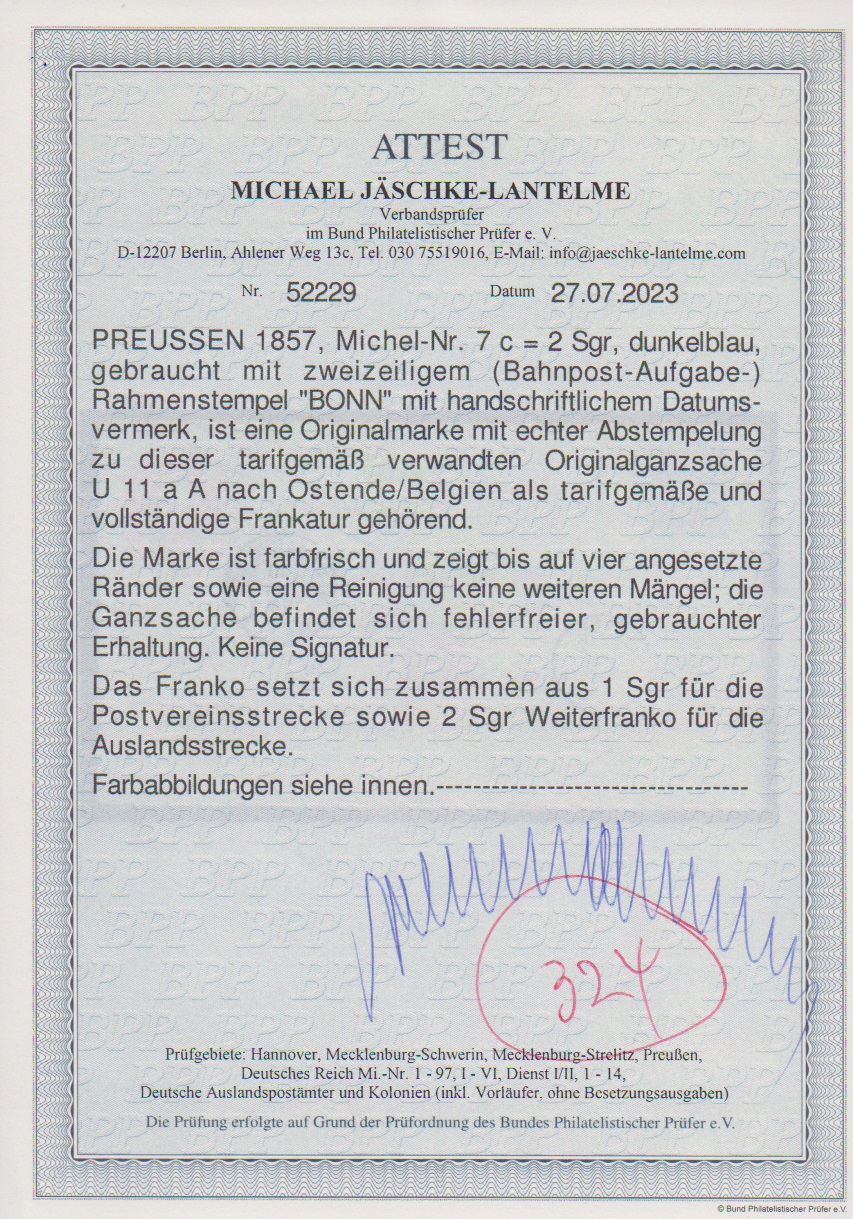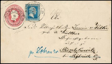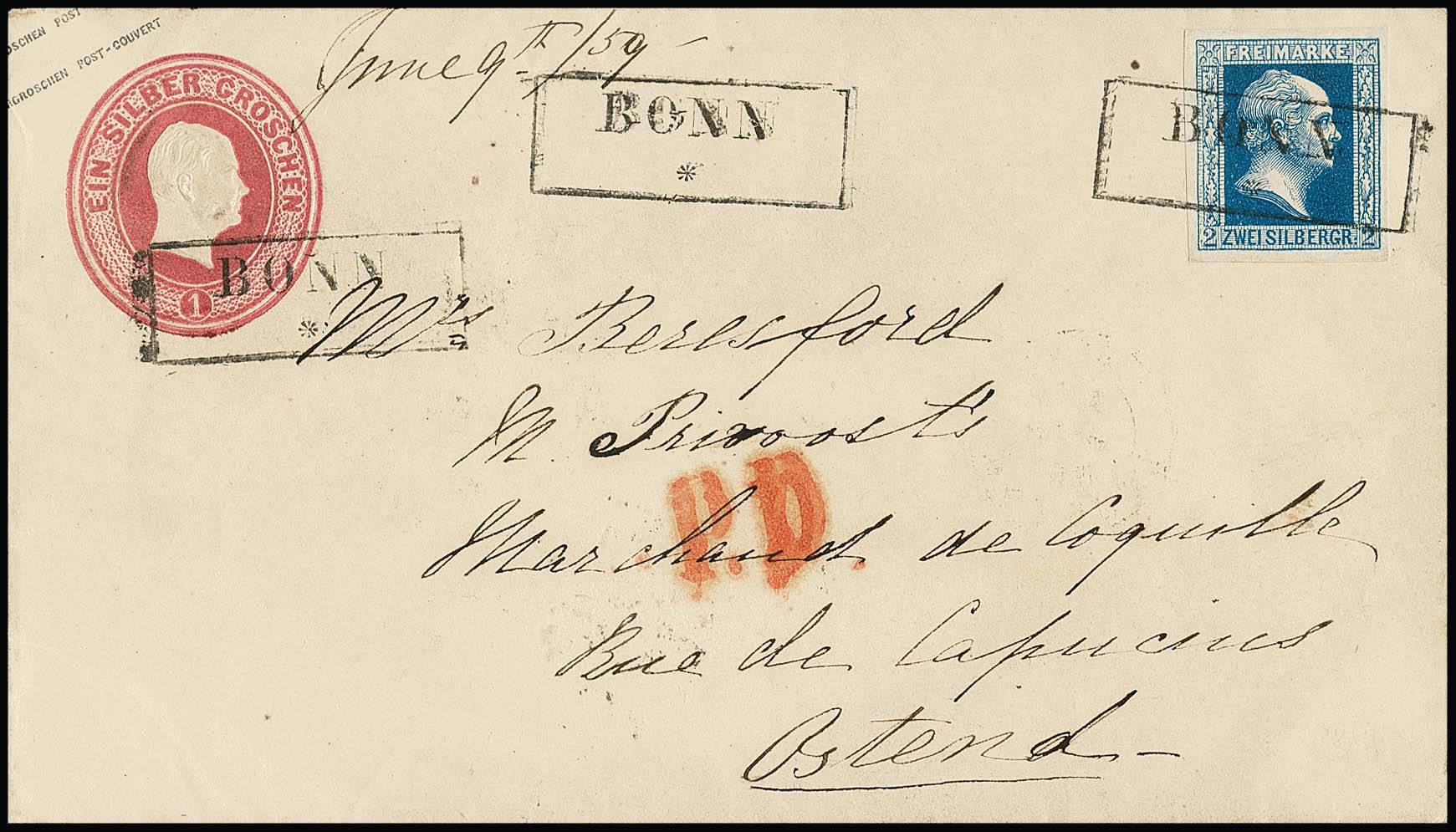 2 Sgr. dunkelblau (Ränder angesetzt) auf Ganzsache 1 Sgr. rosa, mit seltenem vollaptiertem Ra2 "Bonn" 1859 nach Ostende/Belgien, Attest Jäschke-L., ex Slg. Erivan Haub