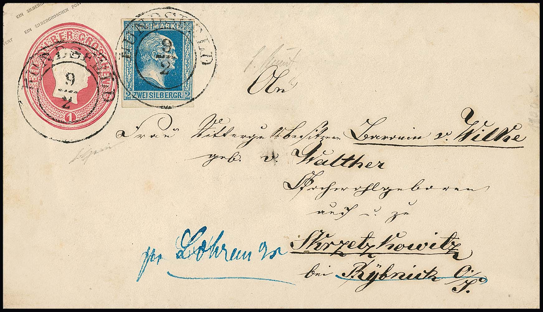 2 Sgr. blau, Luxusstück mit genau zentrischem vorphil. K2 "Hundsfeld" auf Ganzsache 1 Sgr. rosa (diese typische Gebrauchs- und Altersspuren), ex Slg. Erivan Haub