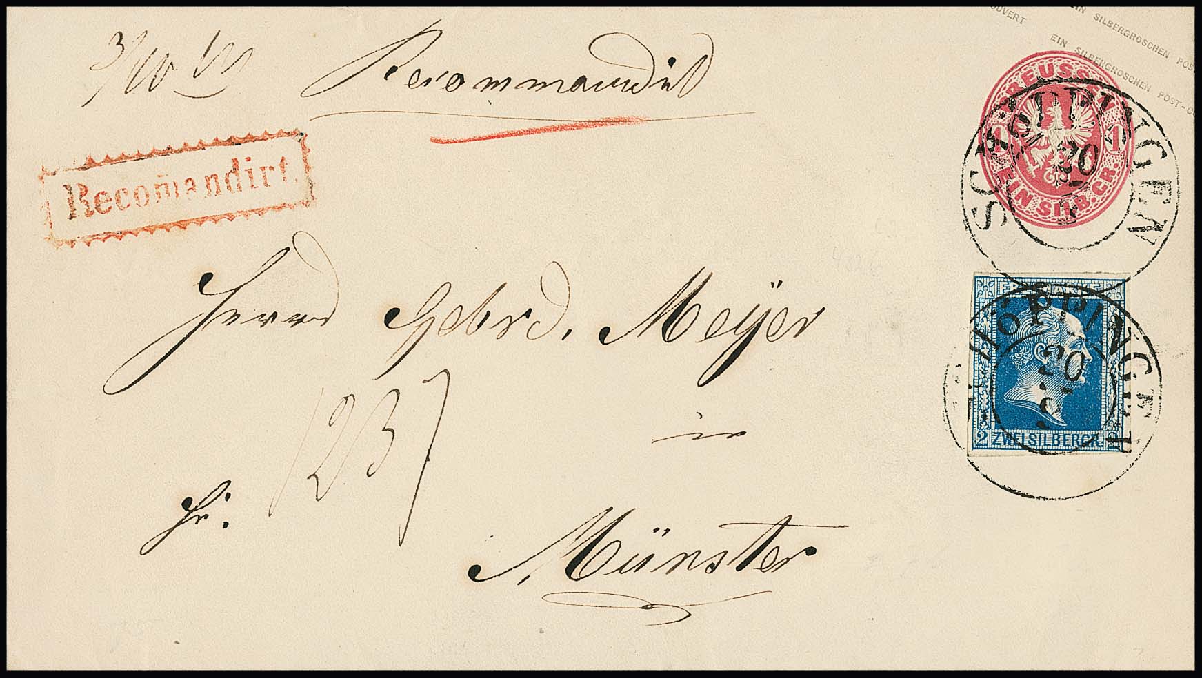 2 Sgr. dunkelblau, perfektes Exemplar in Mischfrankatur auf Wappen-Ganzsache 1 Sgr. rosa, mit idealen vorphilatelistischen K2 "Schöppingen" als Reco-Brief nach Münster. Aus der Metzer-Sammlung, ex Slg. Erivan Haub