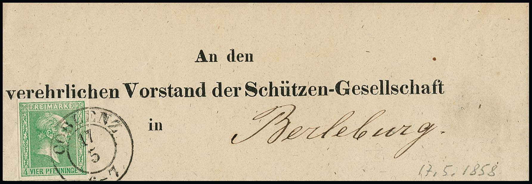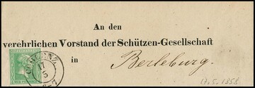 4 Pfg. hellgrün mit klarem K2 "Coblenz" auf weißem Kabinett-Vordruck-Streifband an den "Vorstand der Schützen-Gesellschaft" nach Berleburg