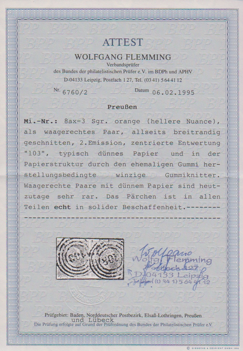 3 Sgr. orange auf dünnem Papier, Prachtpaar mit deutlicher Klischee-Verschiebung, Attest Flemming