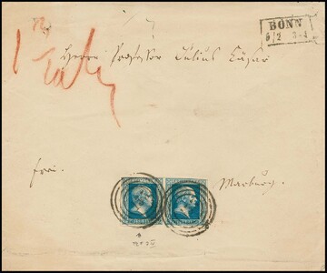 2 Sgr. blau im Paar auf Doppelbrief mit NS "155" und Ra2 "Bonn" nach Marburg. Couvert im Unterrand Faltspur ausserhalb. Linke Marke tadellos mit seltenem Plattenfehler "L von SILBER mit Randlinie verbunden", rechte Marke rechts oben berührt, sign. Banker