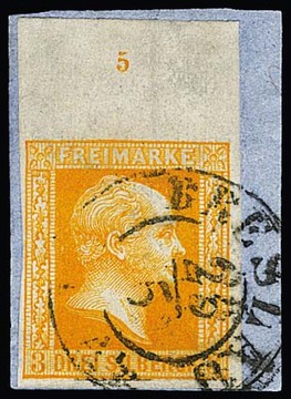 3 Sgr. orange, dünnes Papier (zur Prüfung gelöst und replatziert), mit 11mm breitem oberem Bogenrand auf Kabinettbriefstück mit K2 "Breslau`", sign. Bringmann, aus der 22. Hess-Auktion