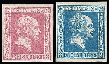 3 Sgr. lilarosa (kl. Fältchen) und graublau, beide Probedrucke, Mi. 400,-