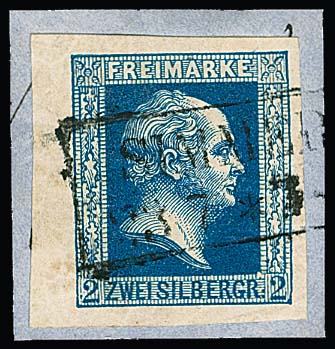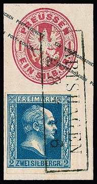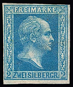 2 Sgr. blau, ungestempeltes Exemplar mit Teilen des originalen Gummis, sehr seltener Teilauflagen-Plattenfehler "diagonaler weißer Strich durch FREIMARKE". Die Marke zeigt Behandlungs- u. Kratzspuren und ist daher nicht sicher ungebraucht attestierbar, dennoch mit dem Plattenfehler eine seltene Marke!
