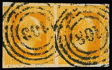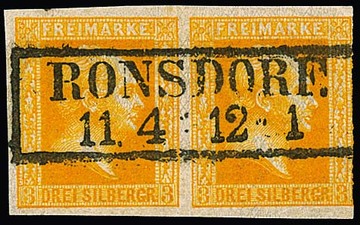 3 Sgr. dunkelorange, dünnes Papier, waager. Paar mit geradem Ra2 "Ronsdorf", rechts berührt, sonst gut. Von dieser Nuance seltene Papierbesonderheit, sign. Engel