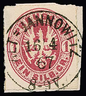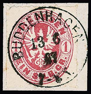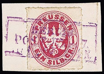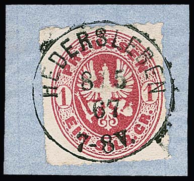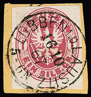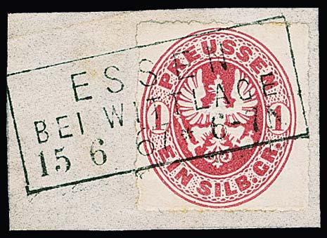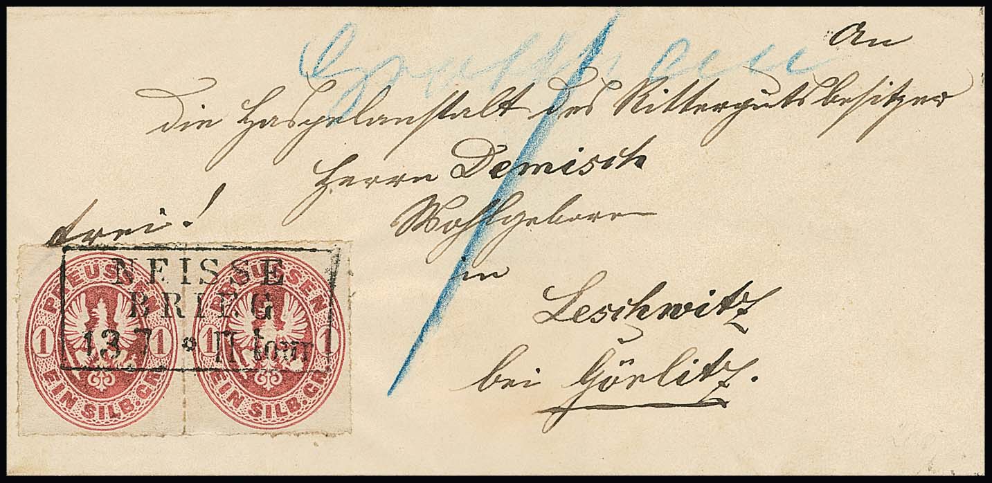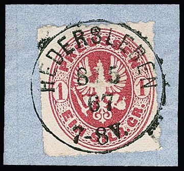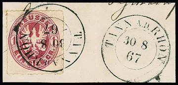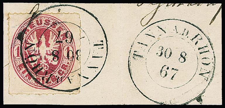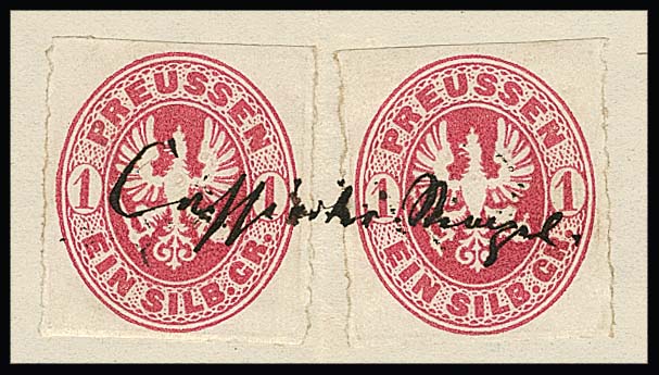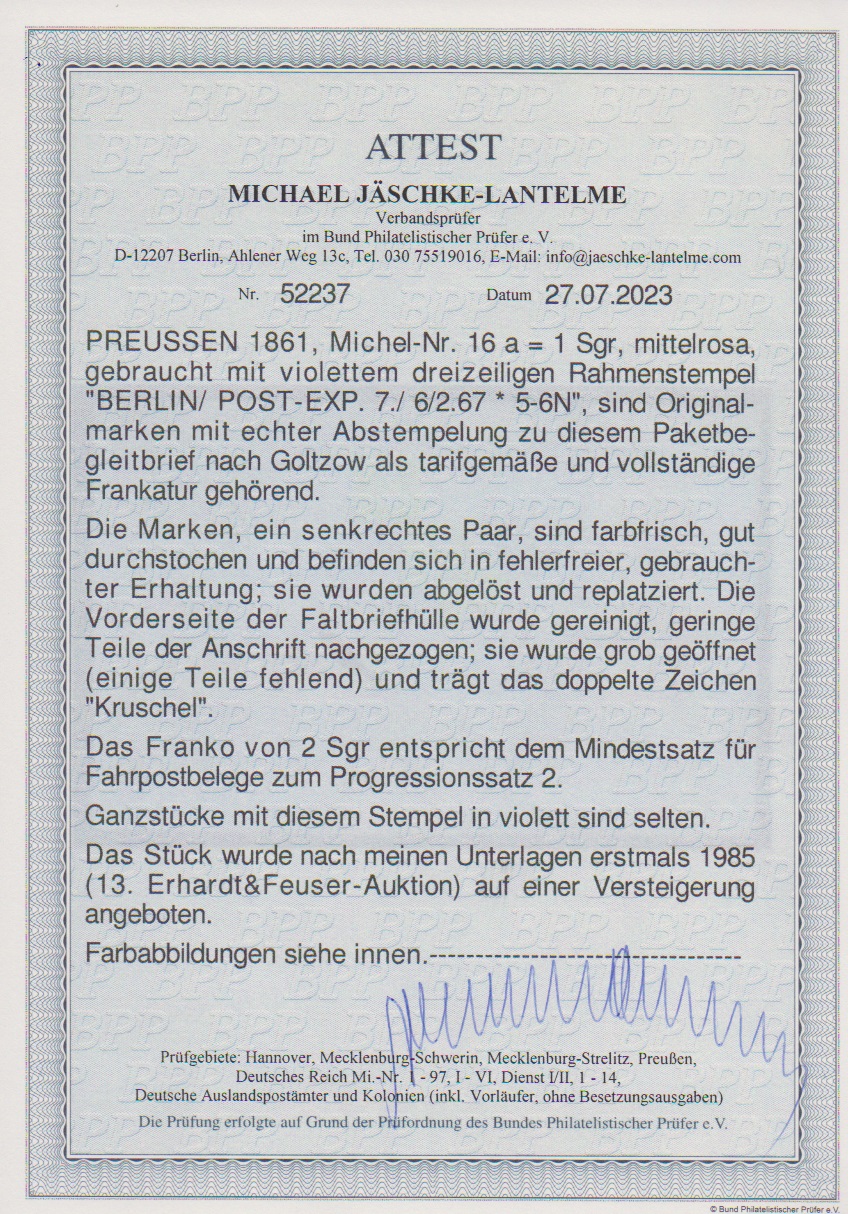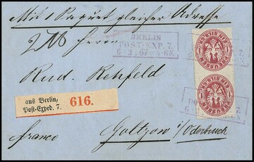 1 Sgr. rosa, perfektes Paar auf blauem Paketbegleitbrief (dieser geringe Reinigungsspuren) mit violettem Versuchs-Ra3 "Berlin Post-Exp. 7" vom 6.2.1867. Dieser violette Stempel war nur vom 30.1. bis 8.2.1867 in Gebrauch. Die etwa eine handvoll bekannten Belege mit diesem Stempel sind Paketbegleitbriefe der Firma Reihlen & Söhne, Stuttgart, die die schlauen Schwaben zwecks Portoersparnis in Berlin auflieferten. Die anderen Paketbriefe dieses Absenders tragen eine 4-Sgr.-Frankatur, so auch Los 895 der 224. Rauhut & Kruschel-Auktion. Das vorliegende Stück stammt aus den Sammlungen Anderegg, John Gunn (13. Erhardt + Feuser 1985) und Kuphal (Kruschel 1994), bei uns registriert seit der 17. Müller-Auktion in Basel 1958. Sign. Kruschel und Attest Jäschke-L., ex Slg. Erivan Haub