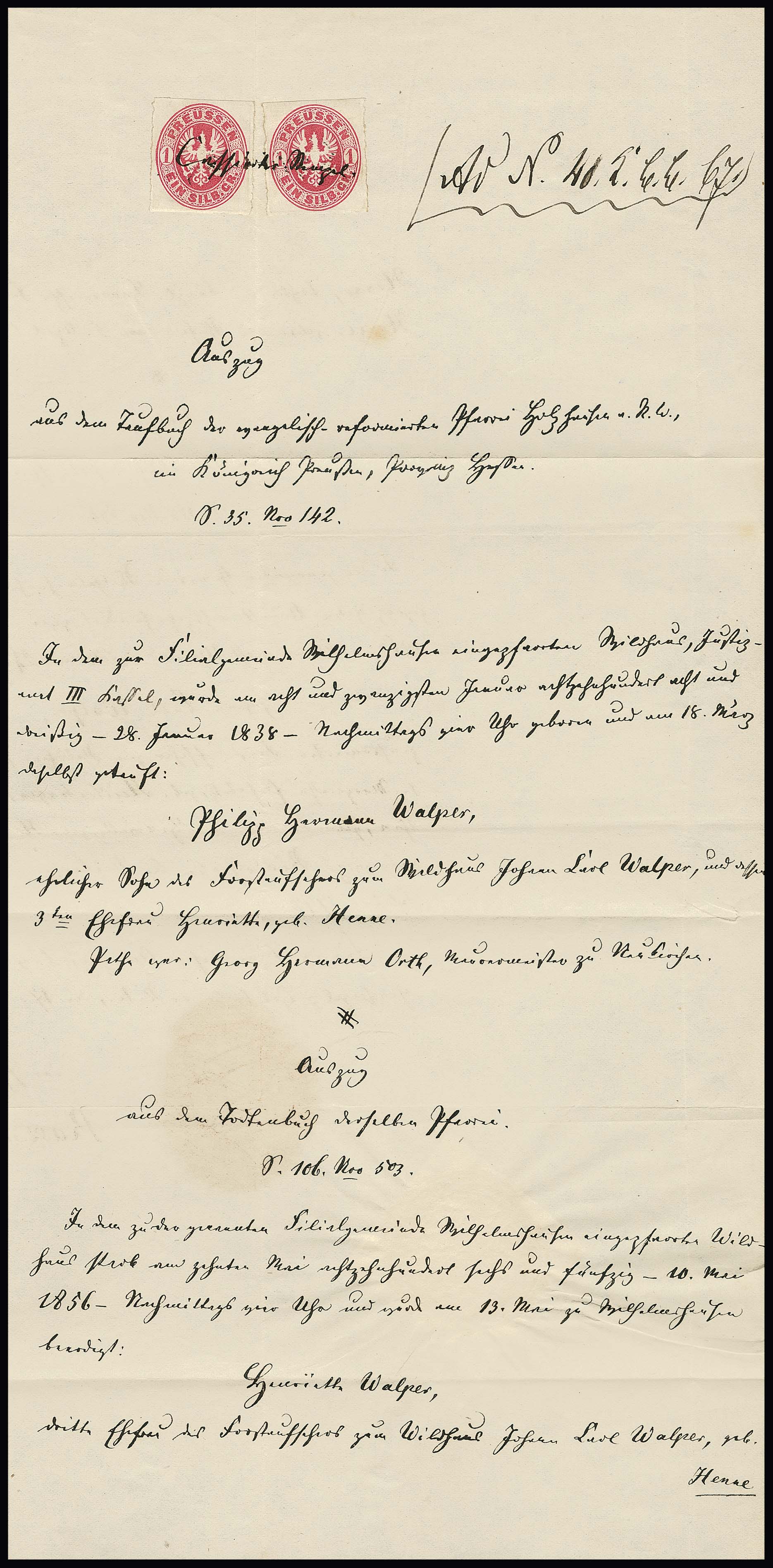 1 Sgr. karmin per zwei in seltener Verwendung der Frei- als Gebührenmarken auf Tauf-Register-Auszug aus Holzhausen 1867, hs. "Cassierter Siegel" (man hatte wohl kein Siegel zur Entwertung zur Hand), ex Slg. Erivan Haub
