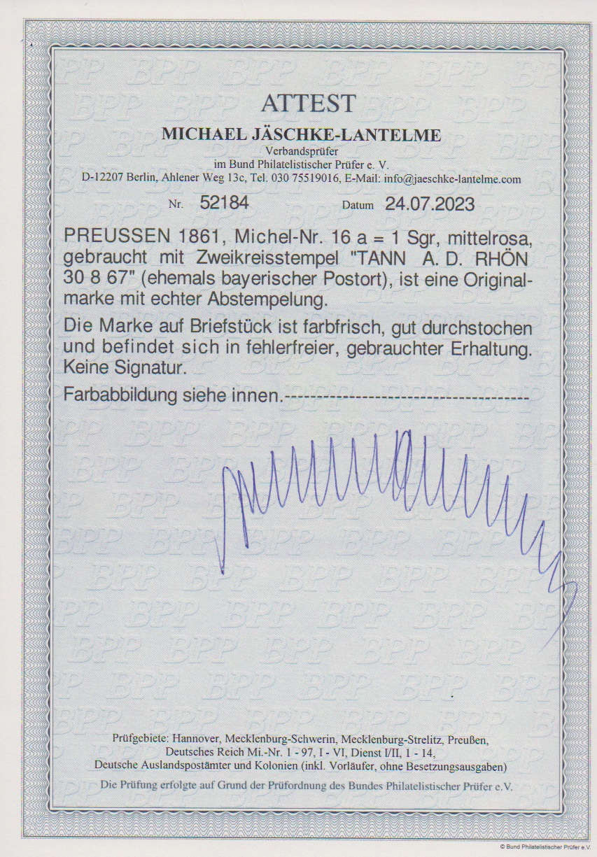 1 Sgr. rosa auf Kabinettbriefstück mit seltenen K2 "Tann a.d. Rhön" (ehemals bayerischer Postort), Attest Jäschke-L., ex Slg. Erivan Haub