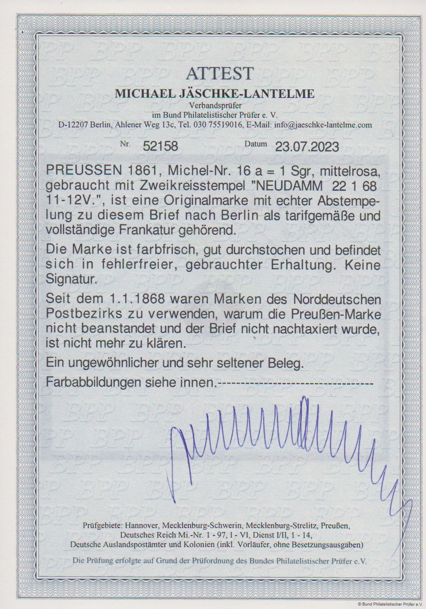 1 Sgr. rosa, tadellos auf Faltbrief mit K2 "Neudamm" vom 22.1.1868. Obwohl nicht mehr frankaturgültig, anstandslos ohne Nachtaxe befördert. Attest Jäschke-L., sign. Metzer, ex Slg. Erivan Haub