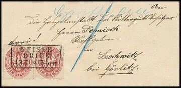 1 Sgr. rosa, Kabinettpaar auf hübschem kleinem Bahnpostbriefchen mit hs. Aufgabe "Grottkau", Marken-Entwertung durch Zug-Ra3 "Neisse-Brieg" (auch rs.), sowie Nachtaxe "1", ex Slg. Erivan Haub