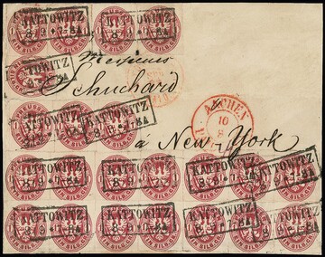 1 Sgr. karmin per 22, dabei größere Streifeneinheiten, auf großem Briefstück (re. oben zur kpl. Vorderseite ergänzt) von einem Überseebrief mit Ra2 "Kattowitz" via Aachen in die USA, unvermeidliche kleinere Mängel, aber optisch beeindruckend, ex Slg. Erivan Haub