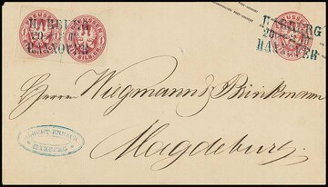 1 Sgr. rosa im Paar auf Ganzsache 1 Sgr. rosa (kl. Aktenspieß), nur mit blauem hannöverschen Bahnpost-L3 "Harburg-Hannover", ohne Stationsangabe (dafür mit Absenderstempel von Harburg) nach Magdeburg, ex Slg. Erivan Haub