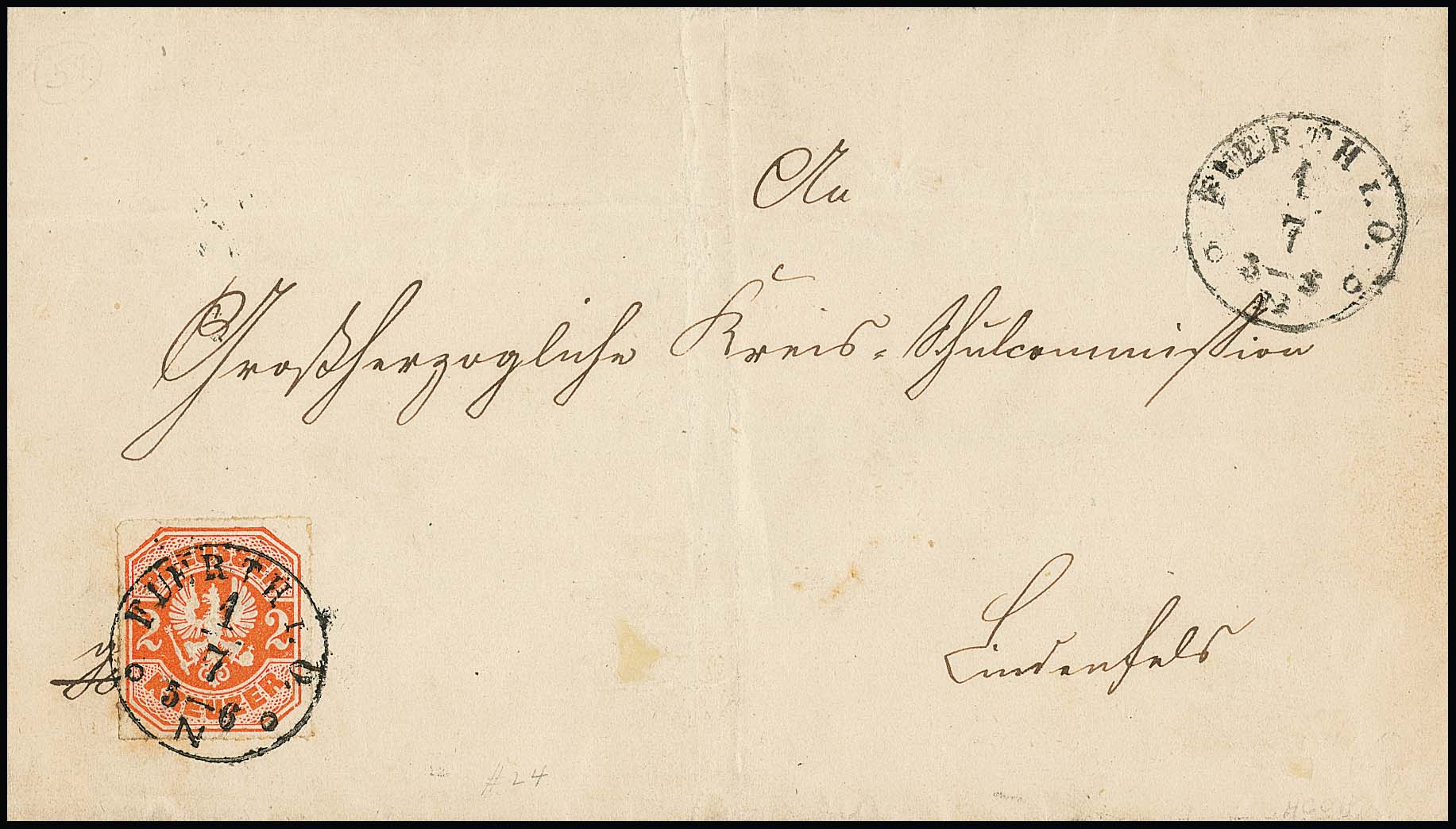 2 Kr. rotorange, Kabinettstück als Einzelfrankatur auf gefaltetem Brief mit sauberem Ersttagsstempel, Taxis-K1 "Fuerth i.O. 1/7 1867", nach Lindenfels. Ersttagsbriefe der Kreuzer-Ausgabe sind selten und nur in einigen wenigen Exemplaren erhalten geblieben, insbesondere von der teuren 2 Kr., Fotoattest Wasels