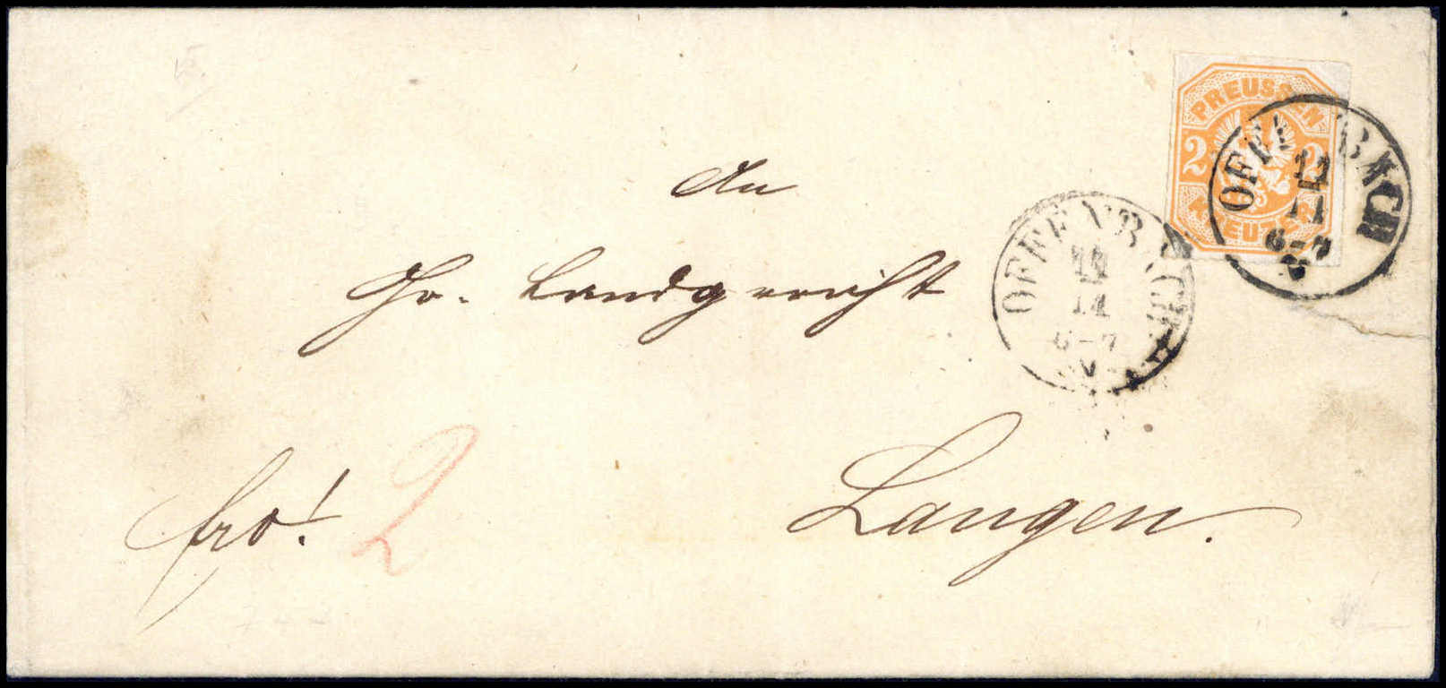 2 Kr. rotorange, Kabinettstück mit klarem Taxis-K1 "Offenbach" auf weißem Brief (rechts kl. Öffnungsfehler) nach Langen. Mi. 750,-