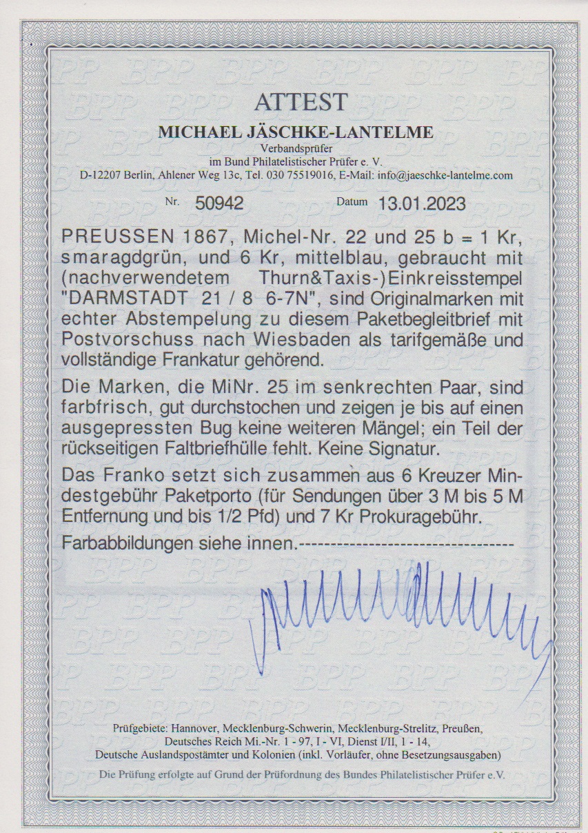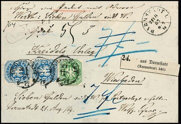 1 Kr. grün und senkrechtes Paar 6 Kr. in der guten Farbe mittelblau auf Paketbegleitbrief (Dreiviertelbogen) mit K1 "Darmstadt" nach Wiesbaden, geglätteter Bug (unauffällig), seltene Kombination aus den Sammlungen Boker und Gunn, Attest Jäschke-L., ex Slg. Erivan Haub