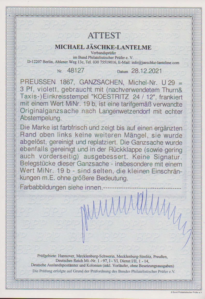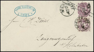 3 Pfge. rotlila auf Ganzsache 3 Pfge. rotlila, mit Taxis-K1 "Koestritz" nach Langenwetzdorf bei Hohenleuben. Trotz kleiner Korrekturen eine seltene Kombination auf der guten 3 Pfge.-Ganzsache, Attest Jäschke-L., ex Slg. Erivan Haub