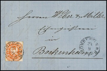 2 Kr. orange einzeln auf Prachtbrief mit nachverw. K1 "Homburg v.d.H." nach Bockenheim, Mi. 600,-
