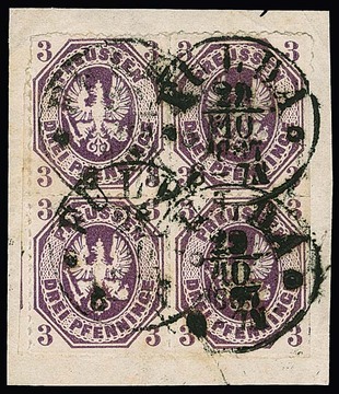 3 Pfge. rotlila, von dieser Marke sehr seltener Viererblock auf Briefstück mit Taxis-K1 "Fulda", rechts zwei Marken etwas Scherentrennung, sonst gute und ursprüngliche Erhaltung, Attest Brettl. Mi. 3750,-