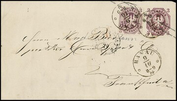 3 Pfge. rotviolett (links unauffällig Scherentrennung) als Zusatzfrankatur auf wertstufengleicher Ganzsache 3 Pfge. mit Taxis-K1 "Hanau 9/10" (1867). Eine seltene Marken-Ganzsachen-Kombination, Fotoattest Kastaun