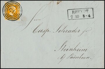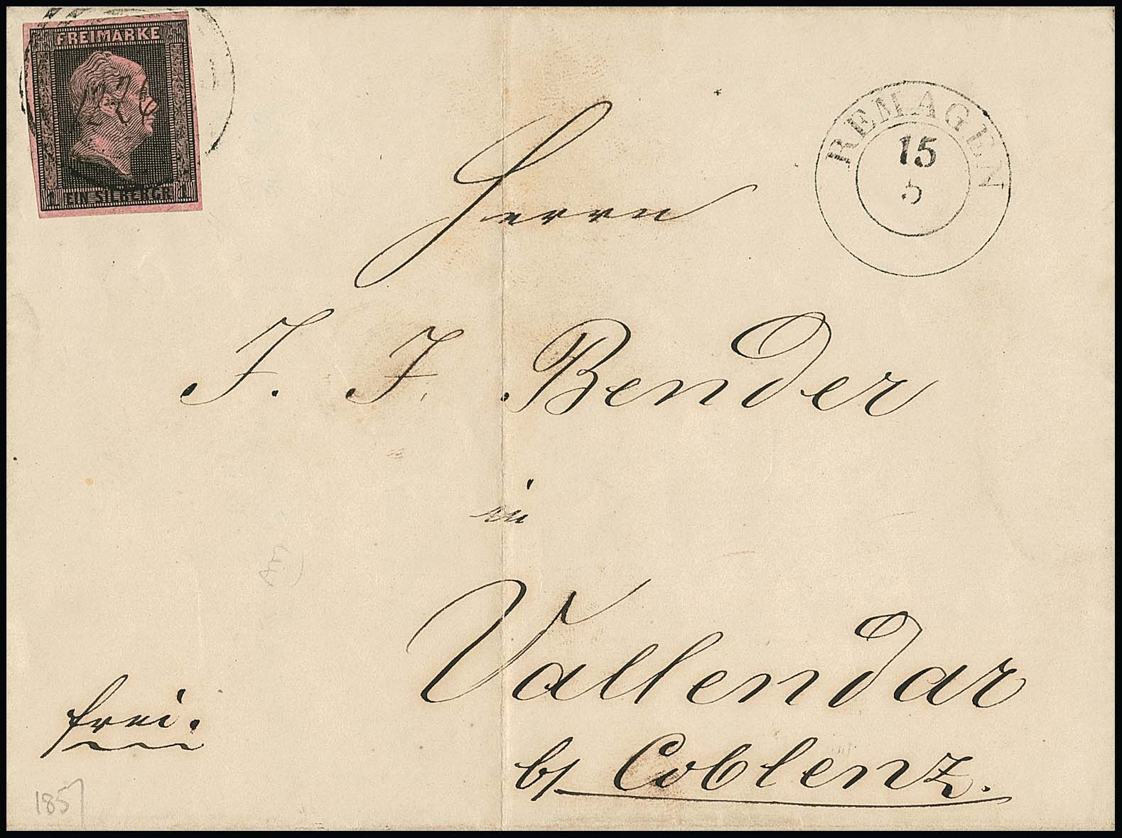 "1226" sehr zart nebst K2 "Remagen" auf mittig gef. Brief 1 Sgr. Der Nummernstempel extrem schwach und ganz offensichtlich postalisch die Ziffern hs. eingesetzt, interessanter Brief
