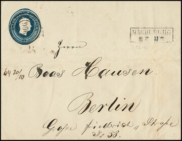 "906" nebst Ra2 "Magdeburg" klar auf großformatiger Kopf-Ganzsache 2 Sgr. (v. 23.10.1851), trotz Gebrauchserhaltung und Falten/Knittern auf einem Großformat sehr selten!