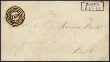 "1158" nebst Ra2 "Posen" je klar auf Kopf-Ganzsache 3 Sgr. gelborange im normalen (17.9.1851) und großen Format (28.10.), trotz stärkerer Gebrauchsspuren bzw. einmal Bruch im Seidenfaden, denkbar seltenes Paar mit dieser Entwertung, gerade auf einem Großformat!