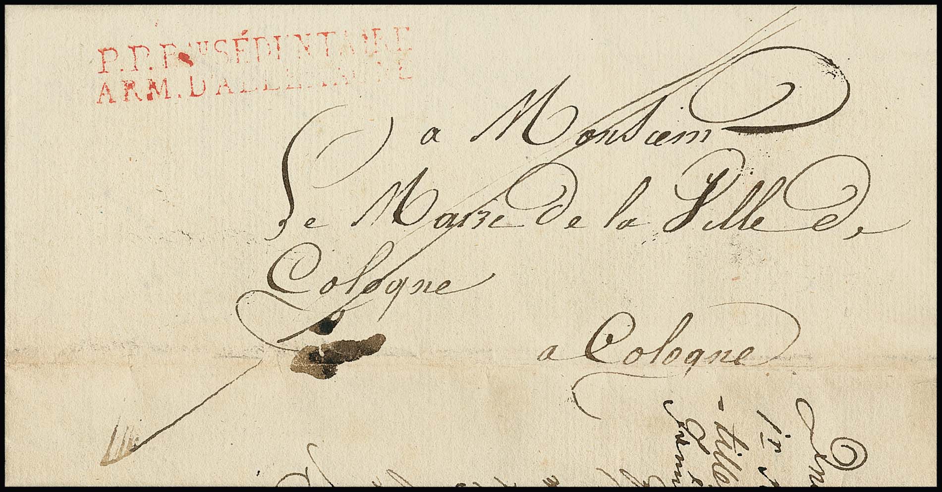 "Minden", 1812, vollständiger französischer Armeepost-Brief (unten Falte) mit Inhalt an den Bürgermeister von Cöln, mit rotem Armeepost-L2 "P.P. BAU SEDENTAIRE ARM. D` ALLEMAGNE". Stempelrarität der französischen Armeepost, bei Reinhardt ist nur eine Verwendung dieses Stempels in schwarz 1812 in Leipzig gelistet, ex Slg. Erivan Haub