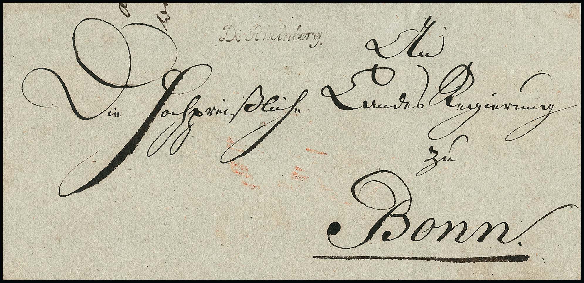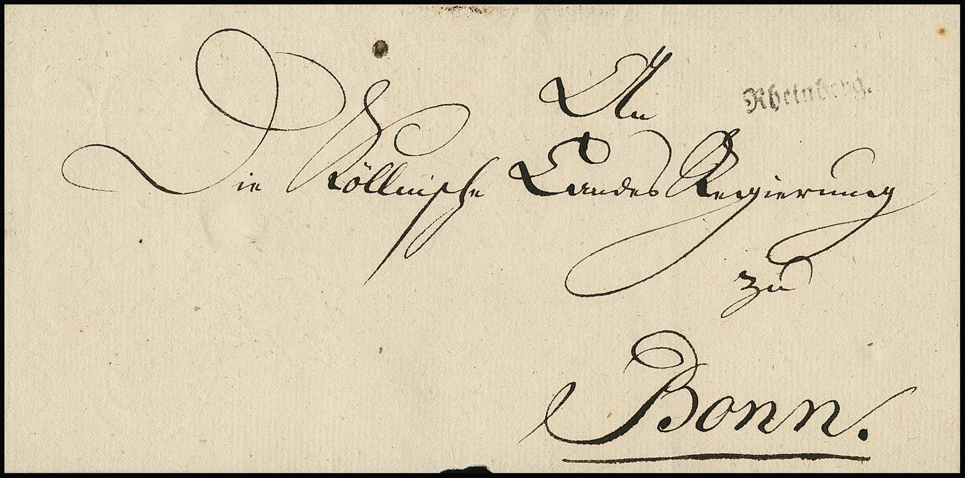"Rheinberg", 1797, Schreibschrift-L1 "De Rheinberg" klar auf datierter Briefhülle nach Bonn, Feuser 2939-1