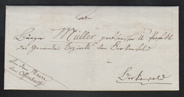 "Oberstein", 1827, kleiner L1 auf Brief, Bittbrief des Gemeinderates von Mittelbollenbach an den Baron von Coburg