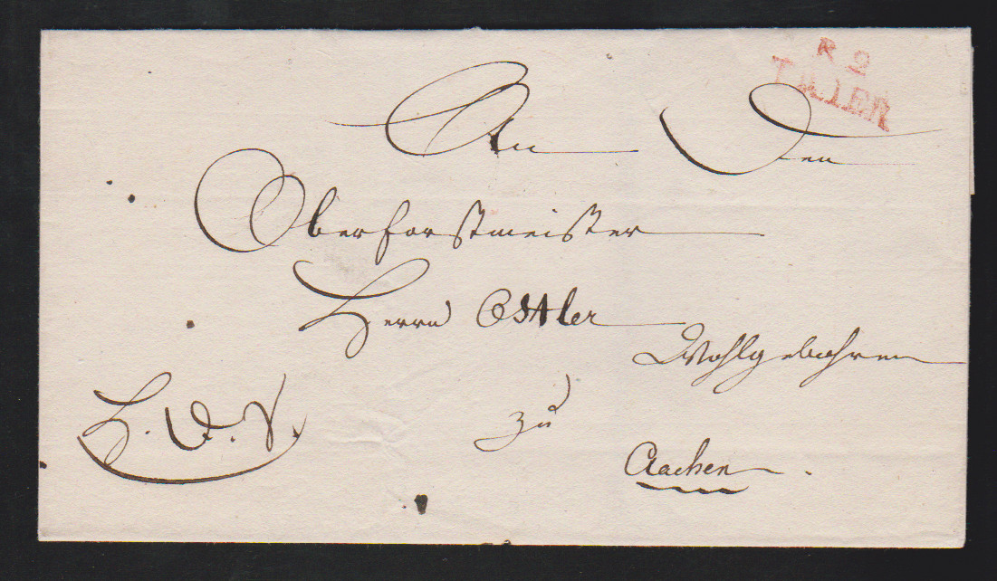 "Trier", (1814), roter L2 "R2 TRIER" klar auf Kabinettbriefhülle nach Aachen