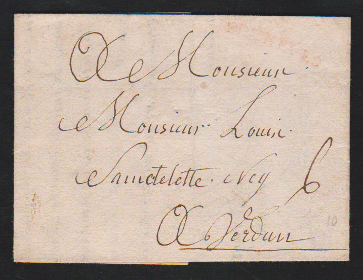 "Trier", 1754, roter L1 "DE TREVES" (etwas schwach) auf Brief nach Verdun