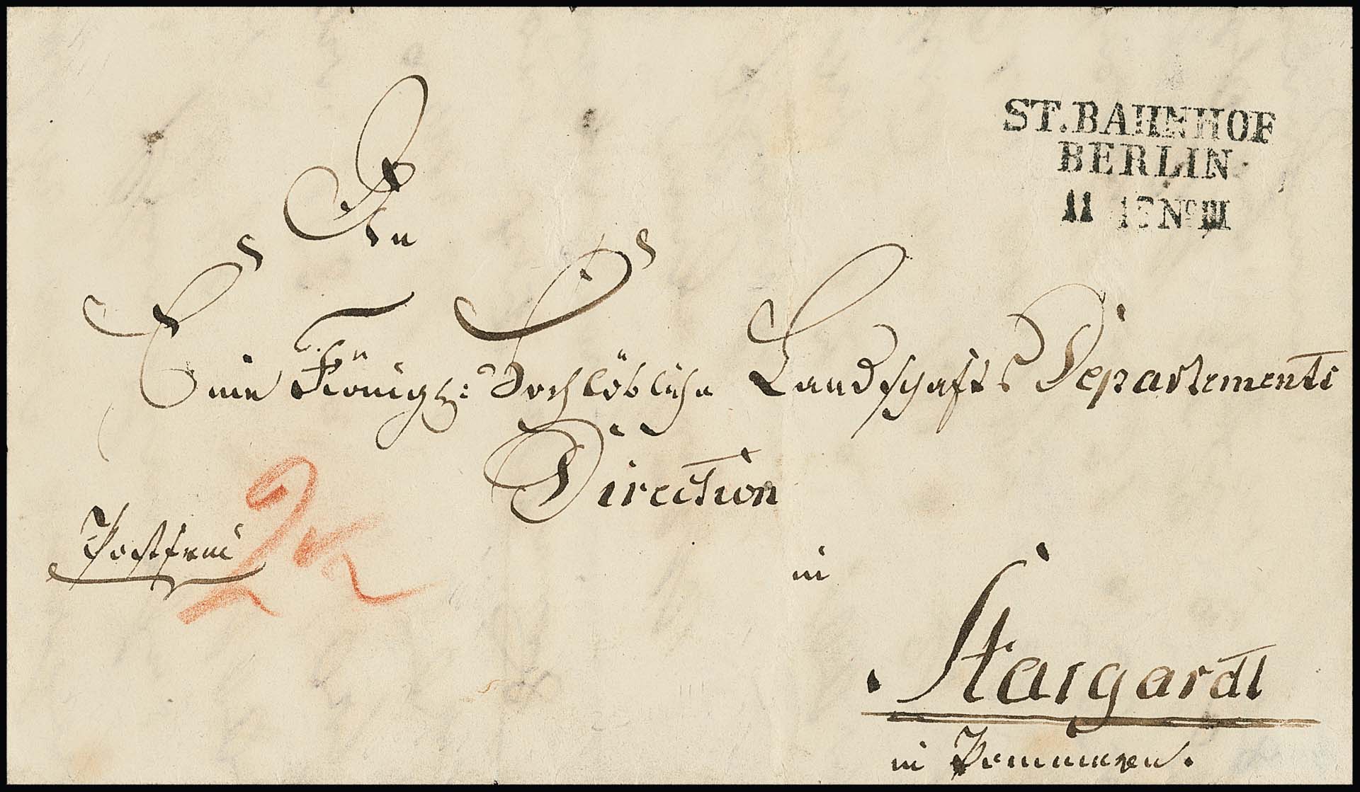 "ST. BAHNHOF BERLIN", L3 des Stettiner Bahnhofes klar auf Brief mit Inhalt, 11.12.1845, nach Stargardt. Es sind nur wenige Belegstücke dieses Stempels (vom 7.2.1844 bis 11.12.1845 in Gebrauch) bekannt, vorliegend zum einen besonders klarer Abschlag, dann noch auf einem Brief mit Inhalt (!), sowie der spätest bekannte Abschlag dieses Stempels (KHBW "Lp."). Ex John Gunn, ex Kuphal (Kruschel 1994 "Luxusbrief ... das schönste Stück dieser allerersten Toprarität"). Dopp. sign. Kruschel, ex Slg. Erivan Haub