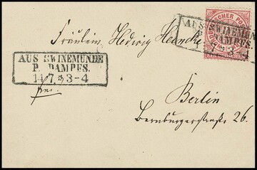 "Swinemünde", seltener Schiffspost-Ra3 "Aus Swinemünde p. Dampfs." auf Kabinettcouvert 1 Gr. NDP, sowie Ra3 in neuer Type 1882 auf 5 Pfg.-Karte (diese kl. Randfehler)