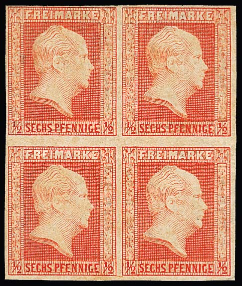 1/2 Sgr. ziegelrot, erster Neudruck von 1864 im ungebrauchten Viererblock (leichte "Oxidationsspuren"), als Original (!) sign. Krause, ferner sign. Bühler, ex Slg. Erivan Haub