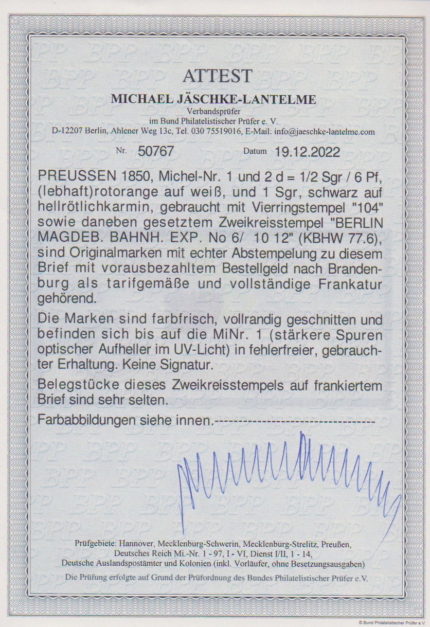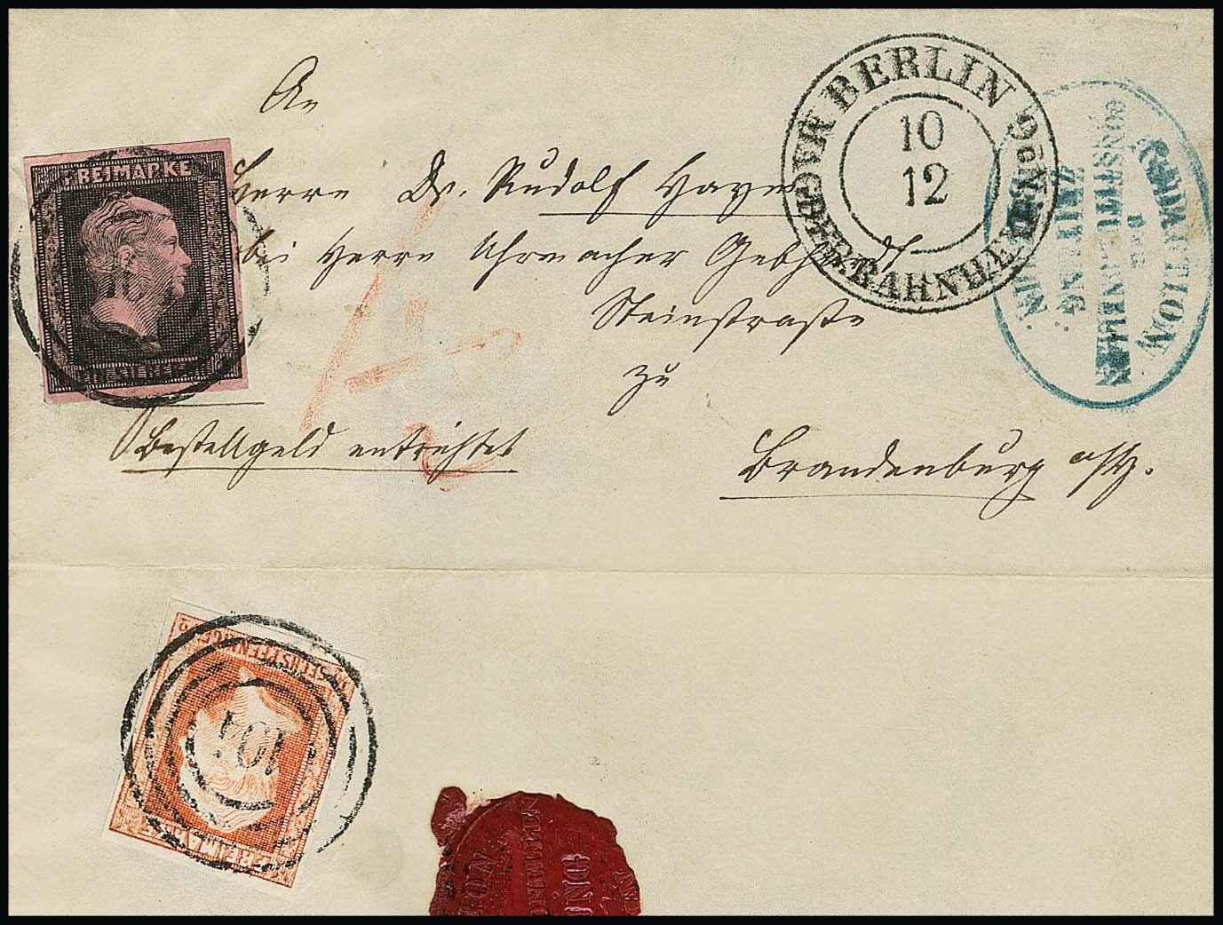 1/2 Sgr. ziegelrot rückseitig als Bestellgeld, vorderseitig 1 Sgr. schw./rosa als Porto, auf kleinem Briefchen mit NS "104" und Neben-K2 "Berlin Magdeb. Bahnh. Exp. No. 6" (vom 10.12.) nach Brandenburg. Die 1/2 Sgr. nur unter UV-Licht sog. "Aufheller-Spuren", sonst tadellos. Diese Stempelkombination ist von größter Seltenheit, bei KHBW nur mit "Lp." bewertet, Kruschel-Hb. 8000,- DM, es ist uns nur noch ein weiterer Brief aus der Kuphal-Sammlung mit dieser Kombination bekannt! Attest Jäschke-L., ex Slg. Erivan Haub