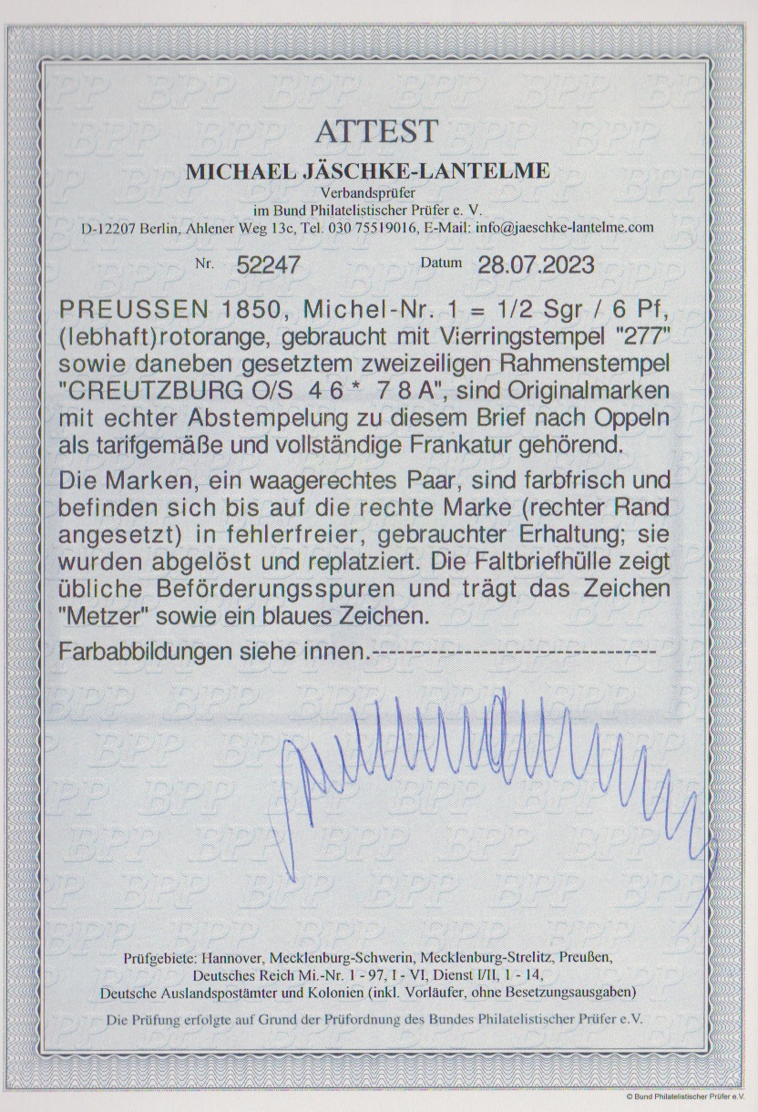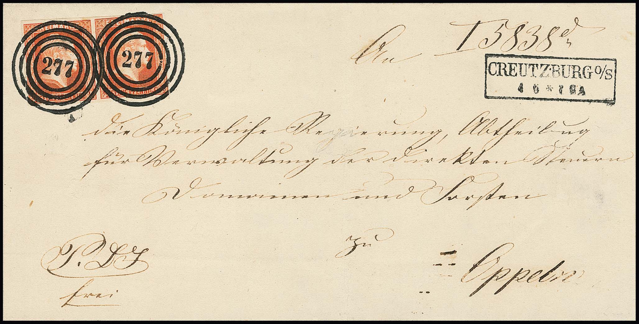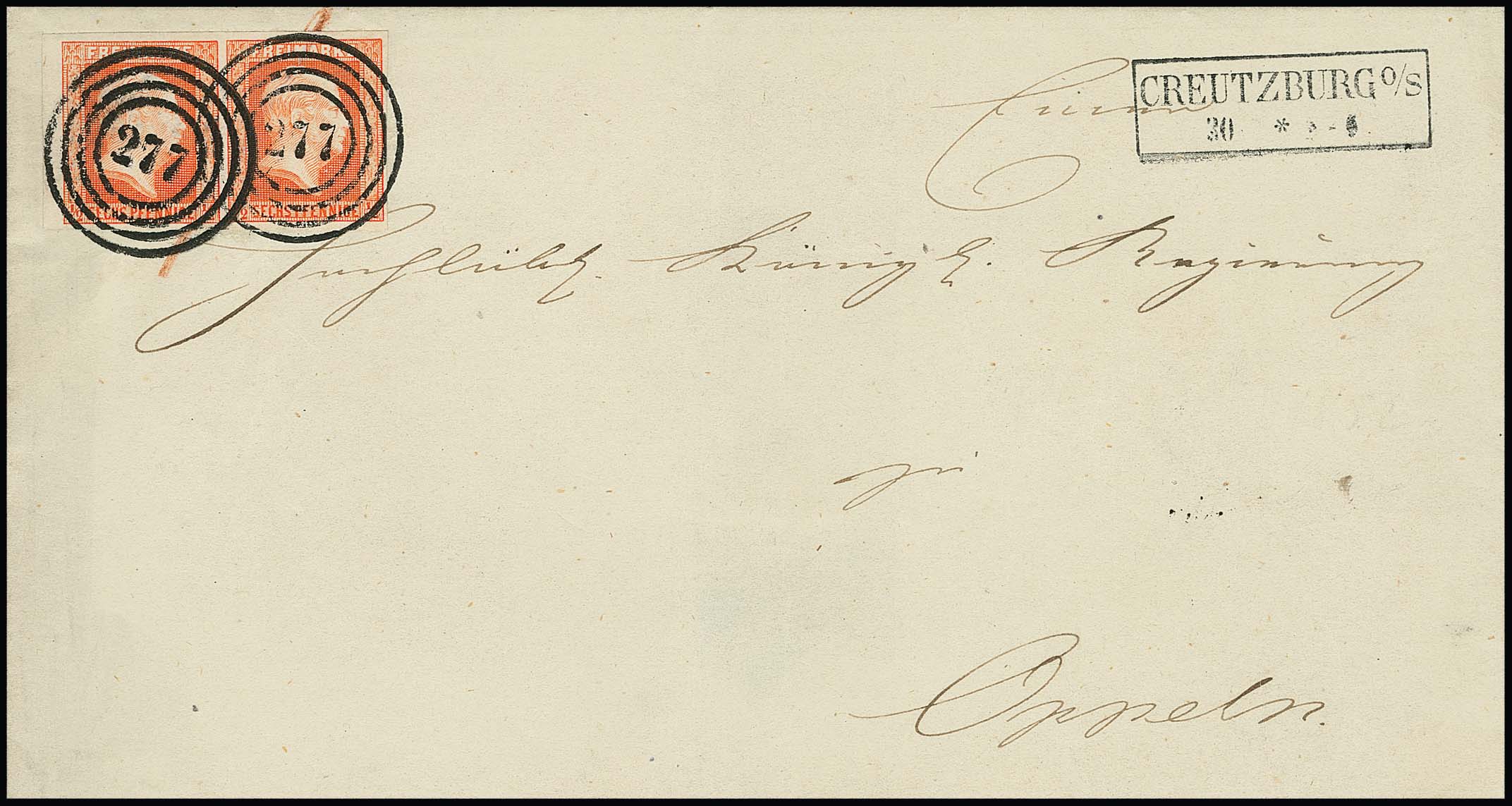 Einmalig schönes Briefpaar aus gleicher Korrespondenz von Creuzburg nach Oppeln: 1/2 Sgr. ziegelrot jeweils im Paar (einmal ein Wert Rand verbreitert, einmal Kabinett vom linken Bogenrand) auf zwei Briefen mit klaren NS "277" und Neben-Ra2 "Creutzburg O/S" nach Oppeln, beide ex Metzer, je Atteste Jäschke-L., ex Slg. Erivan Haub
