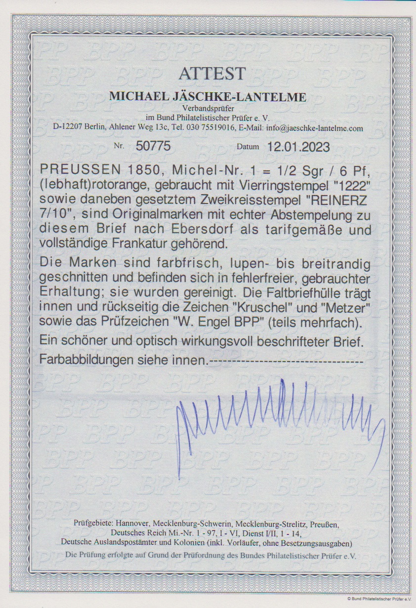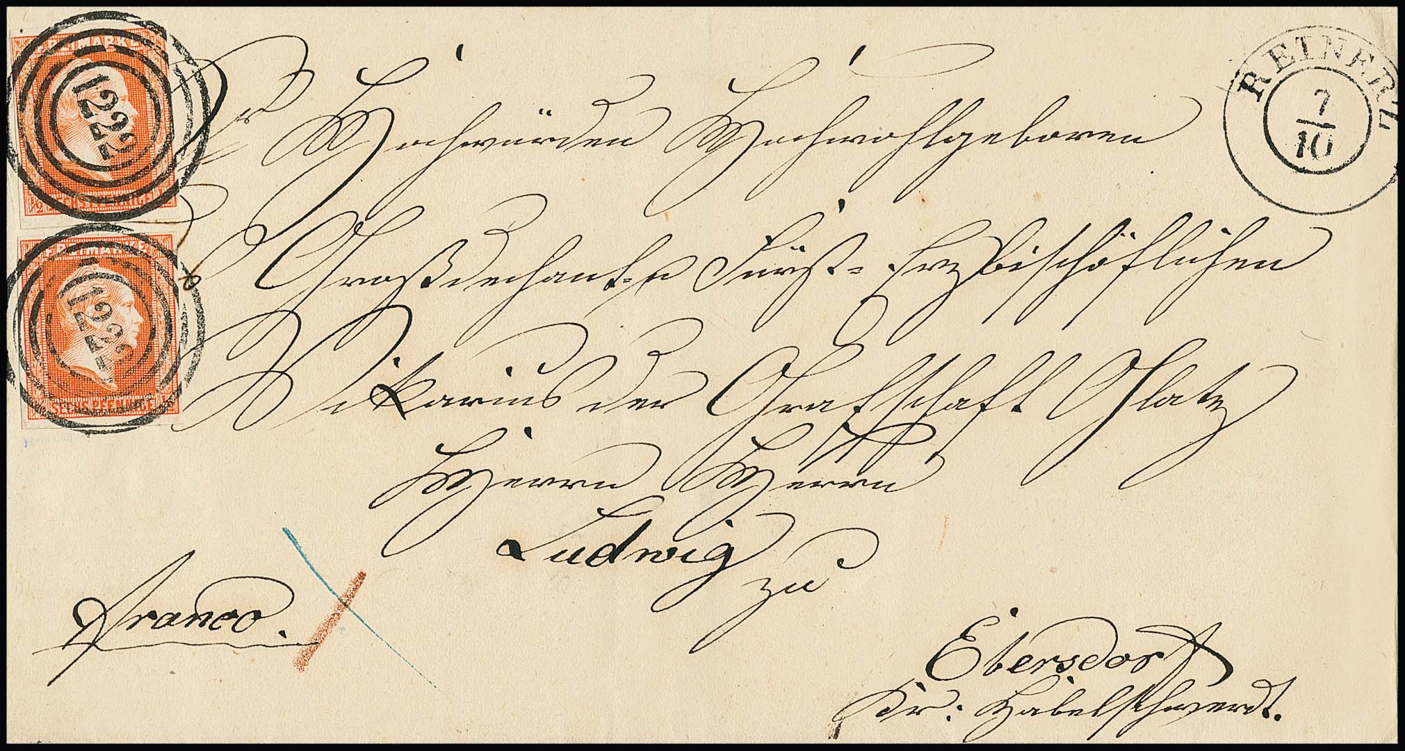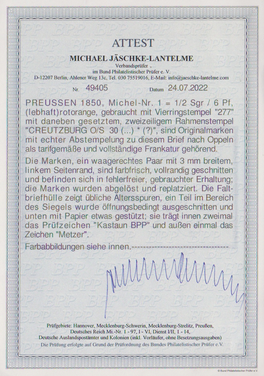 Einmalig schönes Briefpaar aus gleicher Korrespondenz von Creuzburg nach Oppeln: 1/2 Sgr. ziegelrot jeweils im Paar (einmal ein Wert Rand verbreitert, einmal Kabinett vom linken Bogenrand) auf zwei Briefen mit klaren NS "277" und Neben-Ra2 "Creutzburg O/S" nach Oppeln, beide ex Metzer, je Atteste Jäschke-L., ex Slg. Erivan Haub
