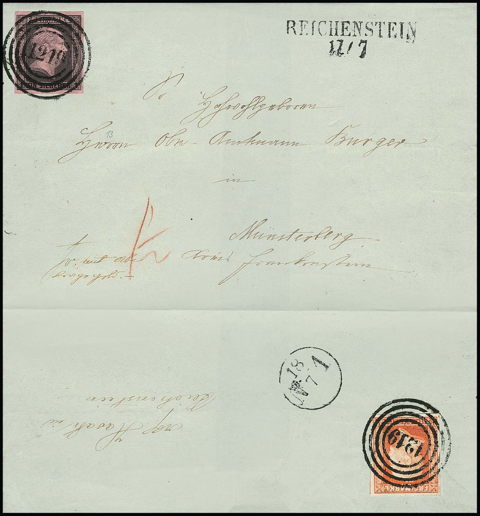 1/2 Sgr. ziegelrot als Bestellgeld rückseitig, vorderseitig 1 Sgr. schw./rosa als Porto (rechter Rand verbreitert), auf schön gestempeltem Brief (rs. fehlt ein Klappenteil) mit NS "1219" und Neben-L2 "Reichenstein" nach Münsterberg. Ex Metzer, ex Kuphal, sign. Kruschel und Attest Jäschke-L., ex Slg. Erivan Haub
