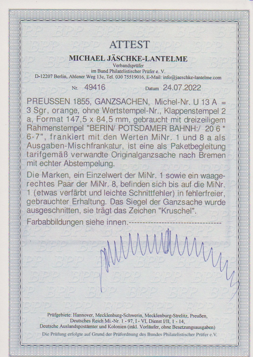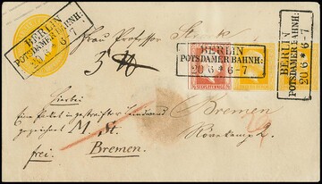 1/2 Sgr. ziegelrot (etwas berührt und leichte Verfärbung), nebst Kabinettpaar 3 Sgr. orange auf Ganzsache 3 Sgr. gelborange, mit Ra3 "Berlin Potsdamer Bahnh." als Paketbegleitung nach Bremen. Ex Metzer, sign. Kruschel und Attest Jäschke-L., ex Slg. Erivan Haub