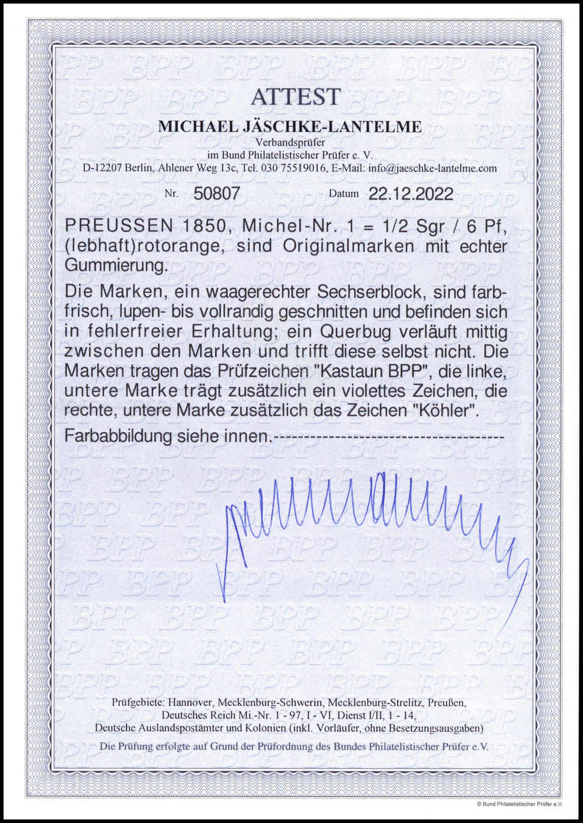 1/2 Sgr. ziegelrot, noch voll- bis breitrandig geschnittener, waagerechter Sechserblock mit vollständigem Originalgummi (im Zwischenraum waager. vorgefaltet, die Marken nicht berührend). Eine seltene Einheit, wobei im Michel-Spezialkatalog noch nicht einmal ein waager. Viererstreifen bzw. Viererblock mit Preisnotierung aufgeführt ist, sign. Kastaun, Fotoattest Jäschke-L.