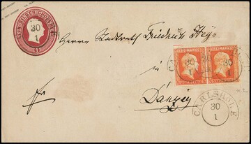 1/2 Sgr. ziegelrot, Prachtpaar mit vorphil. K2 "Carlshöhe" auf Ganzsache 1 Sgr.