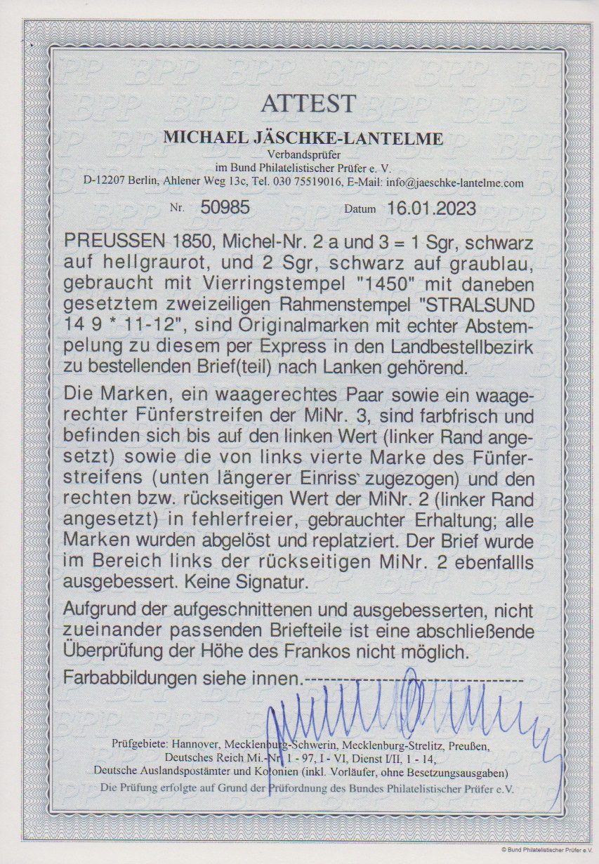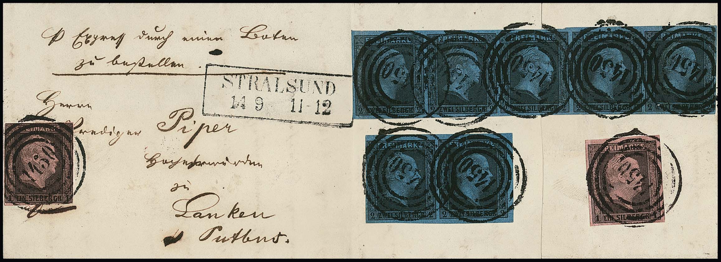 2 Sgr. schw./blau, Fünferstreifen und Paar, nebst 1 Sgr. schw./rosa, auf seitlich nicht ganz komplettem Land-Expreßbrief mit NS "1450" und Ra2 "Stralsund" nach Lanken im Landbestellbezirk von Putbus auf Rügen. Zwei Marken mit je einseitig angesetztem Rand und die vierte Marke des Fünferstreifens mit zugezogenem Riß bzw. linke Marke Bugspur, dennoch ein wahrscheinlich einmaliger Landexpreßbrief mit dieser Frankatur. Das einfache Porto von Stralsund nach Putbus betrug 1 Sgr., so dass der Absender für die Strecke von Putbus nach Lanken (heute Lancken) weitere 15 (!) Sgr. Landexpreß-Botenlohn vorausfrankierte (12km Entfernung Luftlinie), insofern eine nicht erklärbare Frankatur, Attest Jäschke-L., ex Slg. Erivan Haub