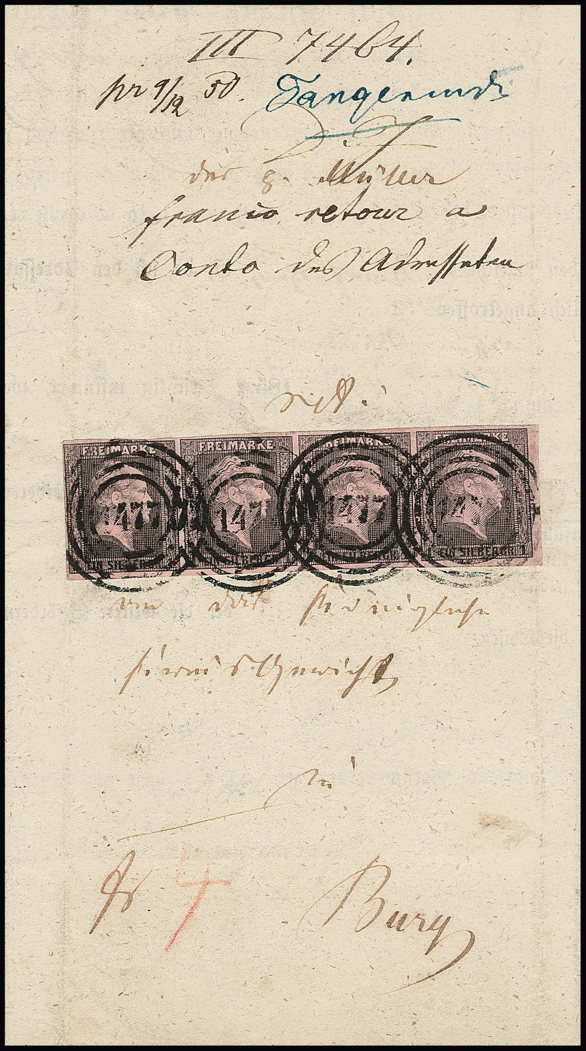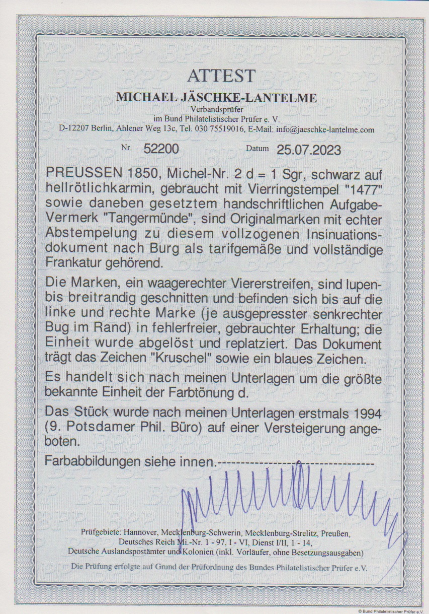 1 Sgr. schw./lilarosa, gut gerandeter Viererstreifen (die beiden Aussenmarken Bugspuren) auf vollständigem Post-Insinuations-Document mit NS "1477" und handschriftlichem Aufgabevermerk "Tarnowitz" aus Dezember 1850. Dieses altbekannte Stück stellt die größte bekannte Einheit der ersten Auflage "lilarosa" auf Ganzstück dar, was eine nicht zu unterschätzende Seltenheit ist, da in der Frühzeit der Markenausgabe weder frankierte Auslandsbriefe noch frankierte Fahrpostsendungen möglich waren, so dass größere Einheiten als Paare dieser Marke Raritäten sind. Aus der Kuphal-Sammlung, von diesem bei Kruschel 1990 ersteigert. Sign. Kruschel und Attest Jäschke-L., ex Slg. Erivan Haub