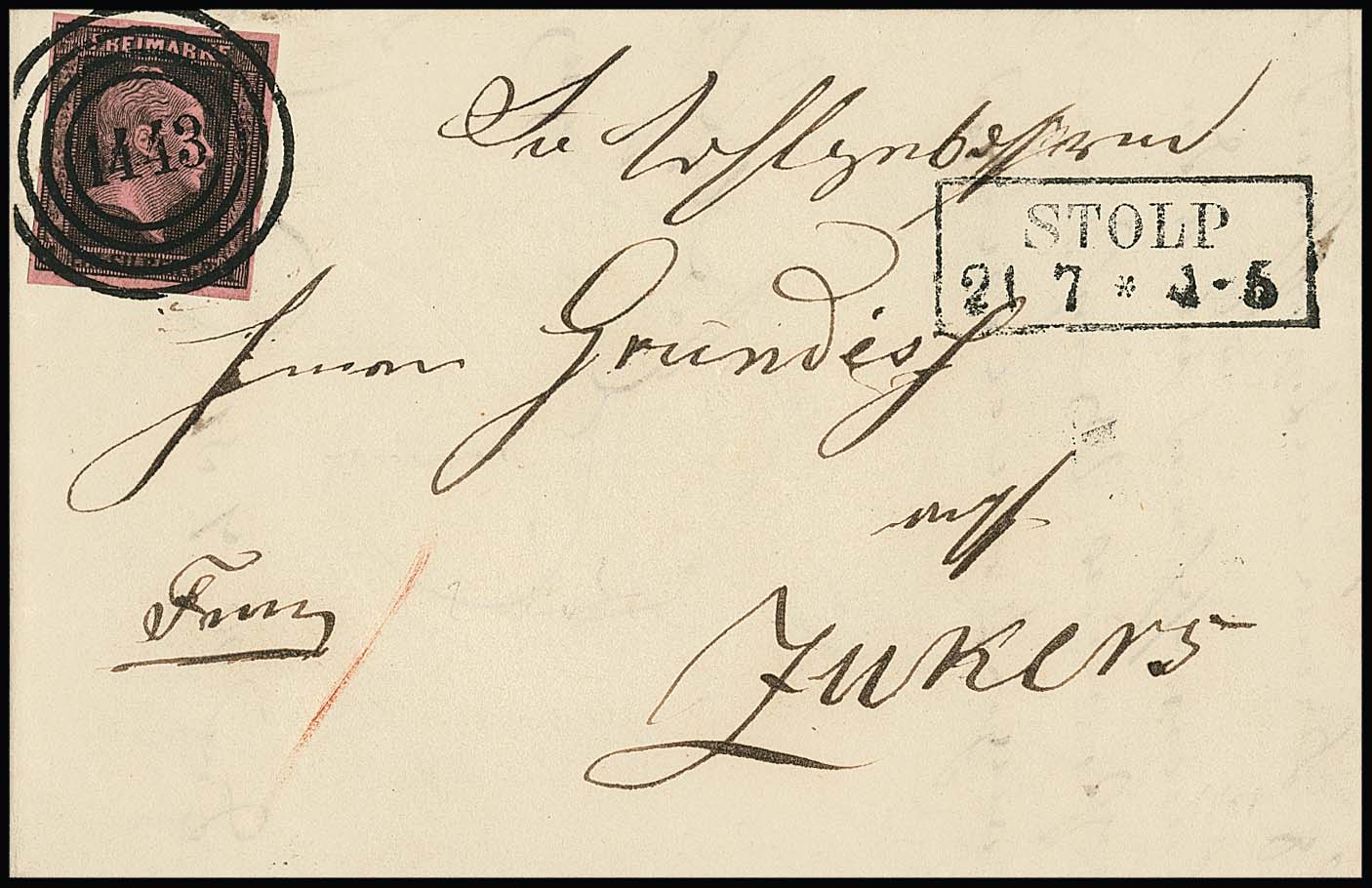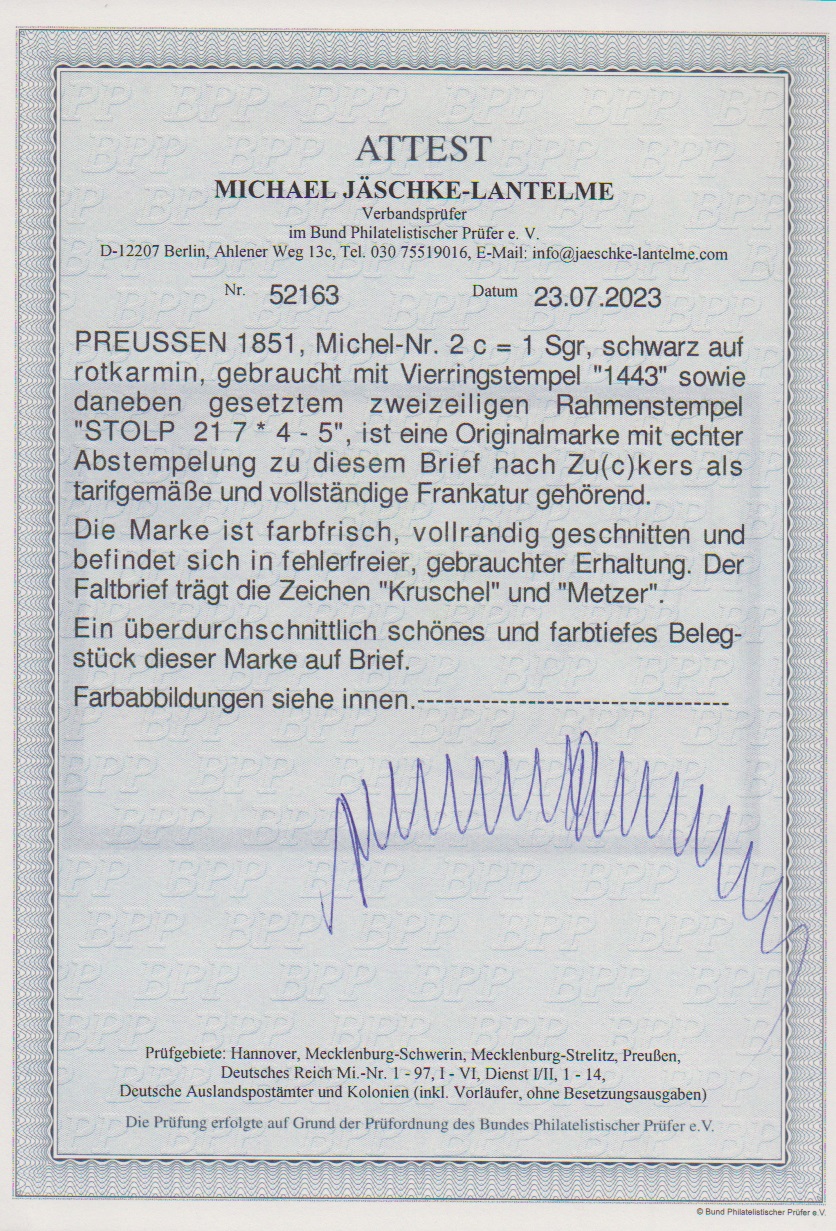 1 Sgr. schw./feuerrot auf Luxusbrief mit idealem NS "1443" und Neben-Ra2 "Stolp" vom 21.7.1851. Einer der schönsten bekannten Briefe der guten feuerroten, ex Metzer, sign. Kruschel sowie Attest Jäschke-L. "Ein überdurchschnittlich schönes und farbtiefes Belegstück". Mi. 1800,-, ex Slg. Erivan Haub