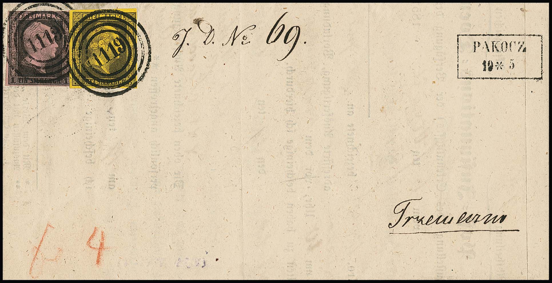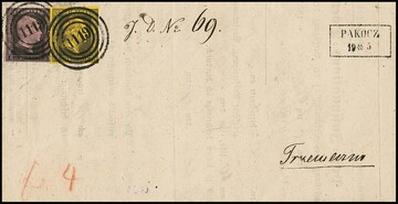 1 Sgr. schw./dunkelrosa und 3 Sgr. schw./gelb auf Luxus-Post-Ins.-Doc. mit klaren NS "1119" und Ra2 "Pakocz", ex Metzer, ex Slg. Erivan Haub