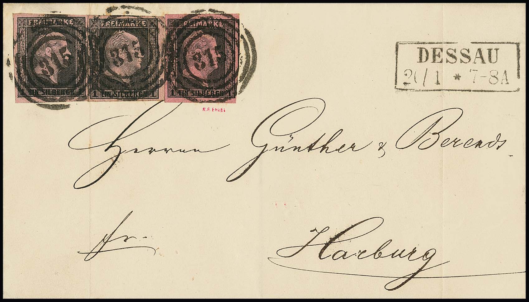 1 Sgr. schw./feuerrot in ungewöhnlicher Kombination mit zwei Einzelstücken 1 Sgr. schw./rosa auf Brief (zwei Falten, die Marken einwandfrei) mit NS "315" und Ra2 "Dessau" nach Harburg. Sehr seltene Auflagen-Mischfrankatur mit der "feuerroten", sign. Brettl, Grobe, R.F. Engel, ex Slg. Erivan Haub