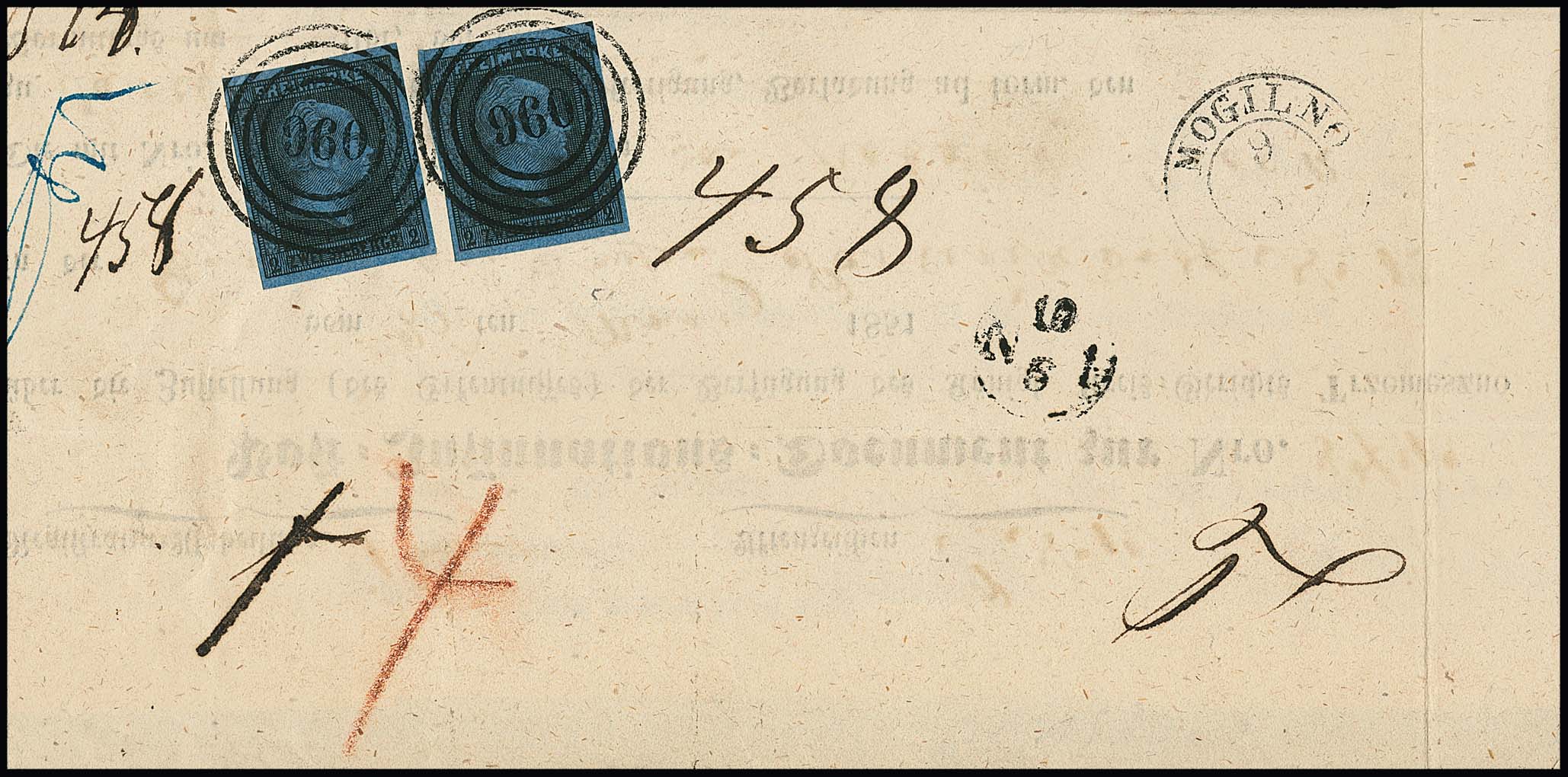 2 Sgr. schw./blau per zwei (einmal Trennschnitt nur im Aussenrand = kein Mangel) auf Kabinett-Post-Ins.-Doc. 1851 mit idealen NS "960" und K2 "Mogilno", ex Metzer, sign. Kruschel, ex Slg. Erivan Haub