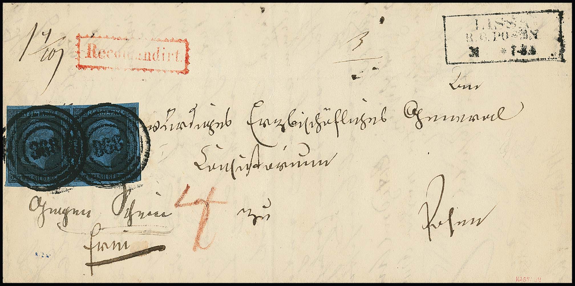 2 Sgr. schw./blau, teils überrandiges Kabinettpaar auf eingeschriebenem Doppelbrief mit NS "868" und Ra3 "Lissa R.B. Posen" 1851 nach Posen, sign. Kruschel, ex Slg. Erivan Haub